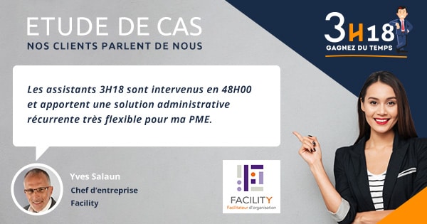 3H18 fait gagner du temps aux chefs d’entreprise en leur offrant des services de gestion administrative « à la carte », sans engagement ni recrutement. Des dizaines de PME, d’artisans, de professions libérales font confiance aux assistants pros 3H18.